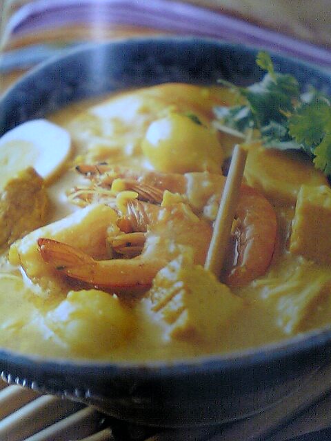 鮮高湯,香茅,南薑,蝦醬熬煮20分鐘,加入魚露,鹽,糖,椰漿煮沸.