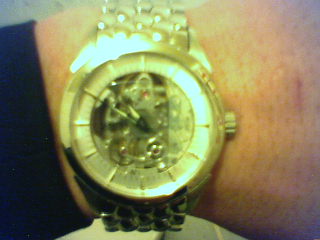 前幾天跟同學去逛街想到沒手錶就去買手錶算是慰勞自己辛苦一年的工作.走進一家之前來過覺得服務很好的店.看了半天沒喜歡的手錶這時店員小姐拿出限量錶出來讓我們看.還說是剛來的新貨本來也不打算賣想自己收藏.全球限量100只還有兄弟棒球隊球員代言的瑞士機械錶羅馬錶ROAMER.看了很喜歡就買了而且還是編號NO.1的哈哈第一只在我手上啦^^而我的朋友考慮一會也買了編號NO.50的那只錶了剛好再我們買下後不到一分鐘有位手戴勞力士滿天星的行家一進門就指明要看這款雙面全簍空的機械錶可惜全店也只有這兩只限量錶都被我們買了.而其它的手錶由於不是雙面全簍空的他不喜歡所以他就失望的走了.臨走前還對我們說都被你們買走了也不留一只給他買.呵呵真的感覺有些對不起他.我們倆各根本不識貨只是單純的喜歡而已.又剛好碰巧店員拿出來讓我們欣賞.這才買下的.而那個人是到處打聽才趕過來要買.偏偏慢我們一步被我們買走了.至於價錢多少呵呵^^秀照片給你們看自己去猜吧!!