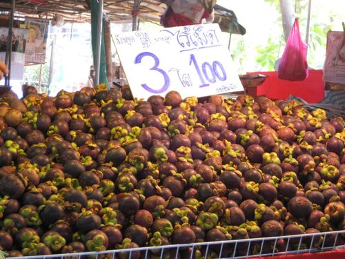 看見照片裡像山一樣高的山竹嗎?現在台灣已經完全不准進口,在先前還買得到的時候,最便宜的山竹一台斤都得花個幾十塊才能吃得到,不過在傳統市場這裡呢,3公斤只賣100塊泰銖,很便宜吧!!