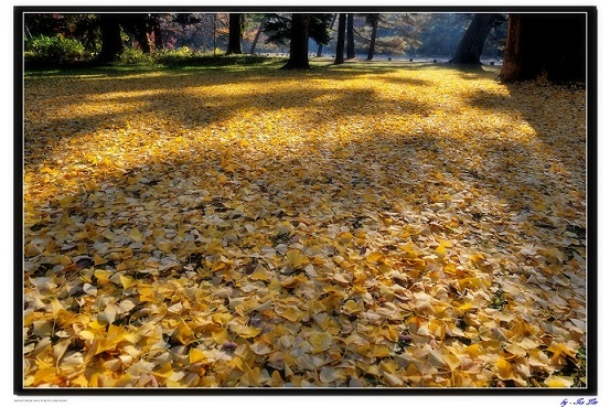 而銀杏葉灑下來的一整片的黃澄