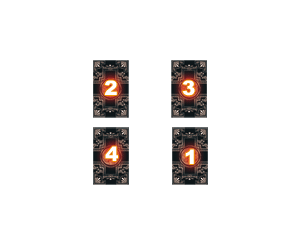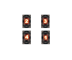 ◇占卜法步驟 1. 按照一般洗牌、切牌程式,然後,取出從上面數來的第四張牌,放在圖示中 (1) 的位置。 2. 將數過的牌放在一旁,剩下未數過的牌重新計數,數到第四張時再取出來,放在 (2) 的位置。 3. 重複上面的動作兩次,分別會得到兩張牌,依順序放到 (3) 及 (4) 的位置。 4. 依順序翻開四張牌,進行解讀。