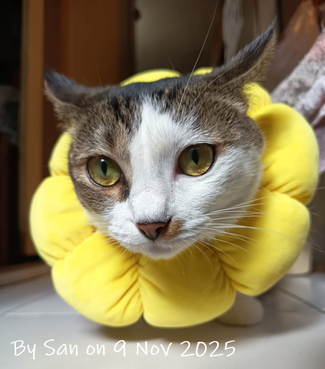 沒辦法,現在的頸圈雖然太小,牠仍舔得到手手,但還是得給牠載上。