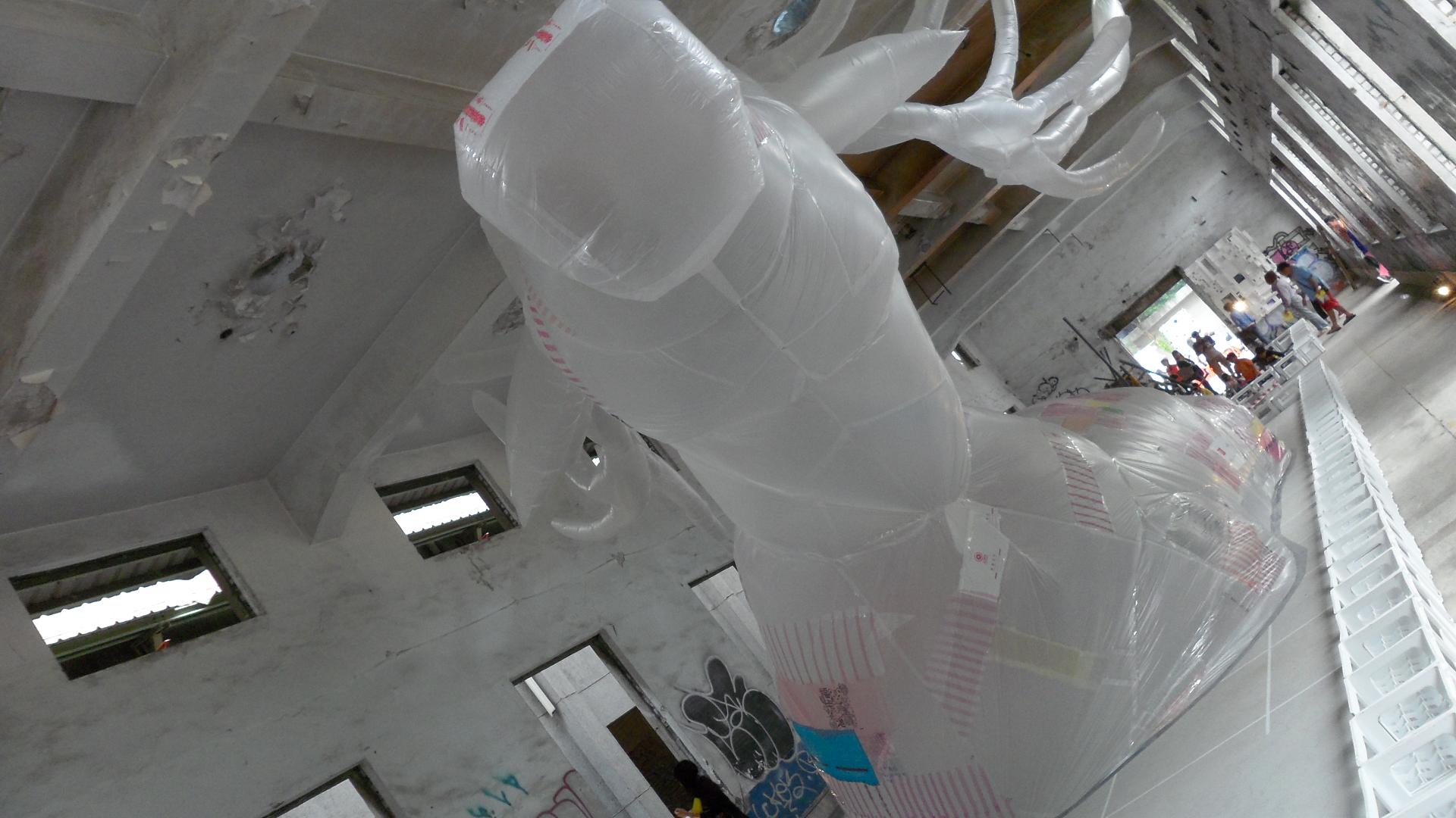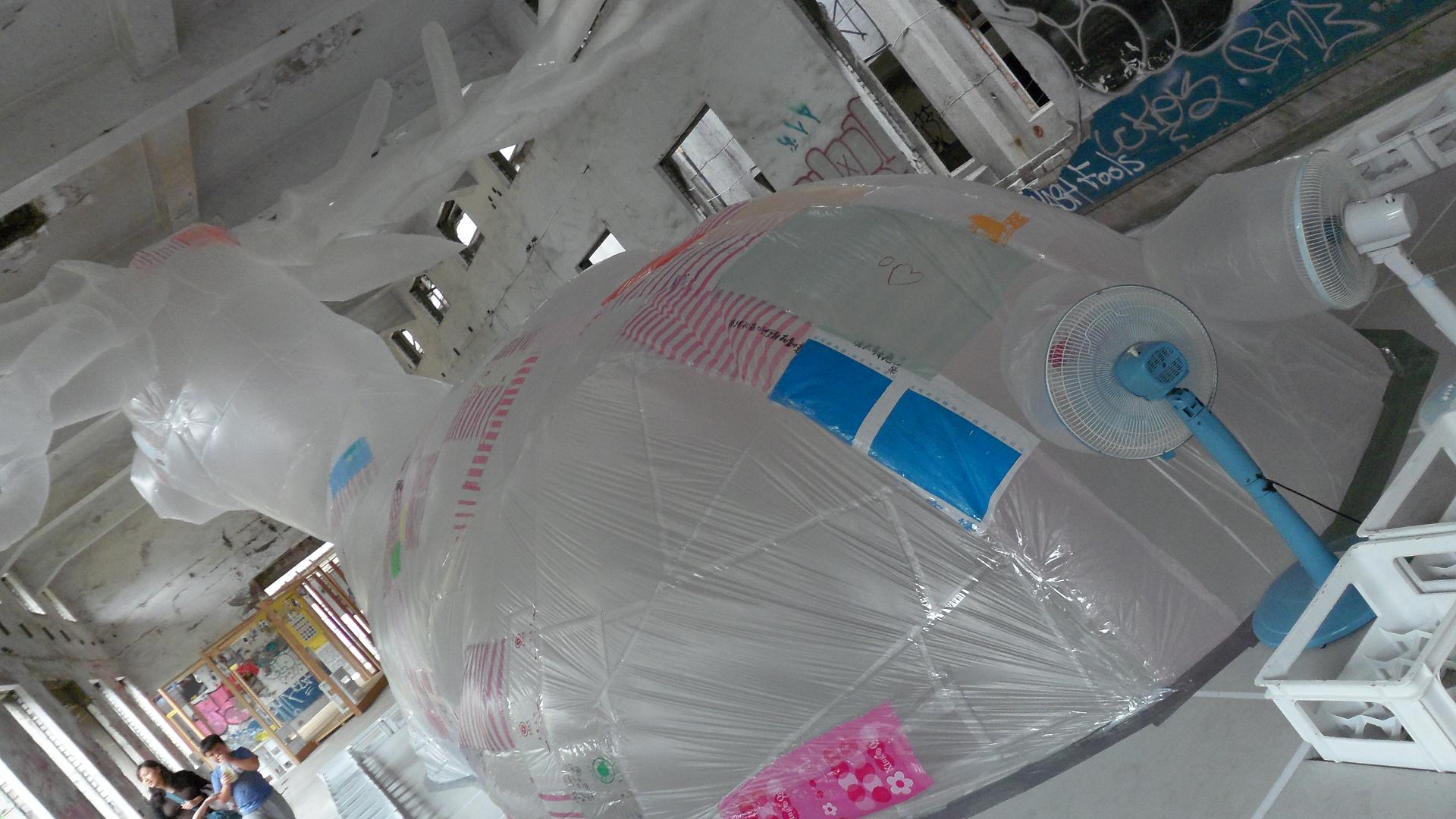 超利害的利用塑膠袋作成的 在大屁屁後面2隻電風扇 把它撐起來了
