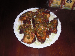 沾料:醬油一大匙,白醋一大匙,砂糖半大匙,水一大匙,辣椒兩根切末,蒜兩顆切末,香菜末,麻油一小匙,花椒粉一小匙,檸檬半顆的汁,魚露一大匙