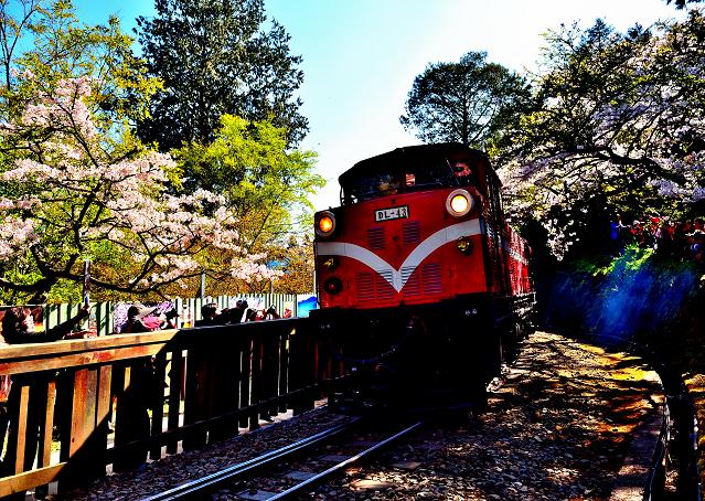 滿滿的人潮擠上了阿里山來拍攝火車與櫻花~