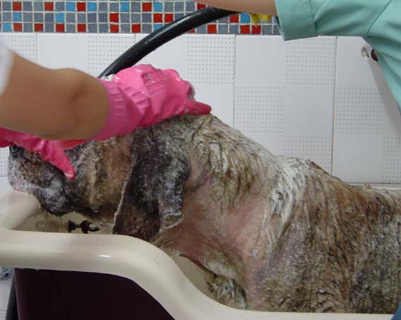 本來想用藥泡濕,等緣圓身上硬硬地髒東西掉下來再洗,但不行,只能用刷子刷~~