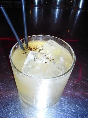 這杯是2008奧斯卡影展指定頂級特調 Golden Goose 金燦灰雁,就是剛剛bartender特別調給范瑋琪喝的那款,算是比較炫目一點的調酒,grey goose 先浸泡過肉桂,然後加上新鮮檸檬汁跟薑汁汽水,然後灑上可食用的金箔做為裝飾,相當地炫麗奢華,而且有著濃濃的肉桂味,是一杯很別出心裁的vodka 調酒喔,我覺得也不錯喝。