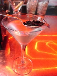 這杯這杯就是傳說中 “2008坎城影展指定頂級特調”—Perle de Carviar 黑珍珠灰雁,也就是grey goose調成的 Martini,酒杯上放著一湯匙最頂級的法國魚子醬,也就是這個星光之夜的最大噱頭。這杯 martini 是由 grey goose、苦艾酒、跟茉香綠茶調製而成,其實單就這一杯酒的口味而言,我並不是非常地喜歡,不過搭配上魚子醬這樣的喝法,倒是讓整個口感蠻不錯的,先吃一小口魚子醬,再喝一口martini,再吃一口魚子醬,於是我喝了三杯,好貪小便宜的感覺喔,真是不好意思…終於跟賤佩ㄠ到照片了...