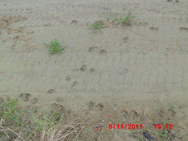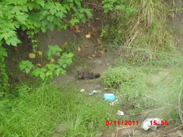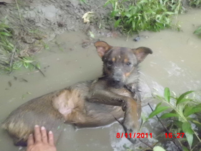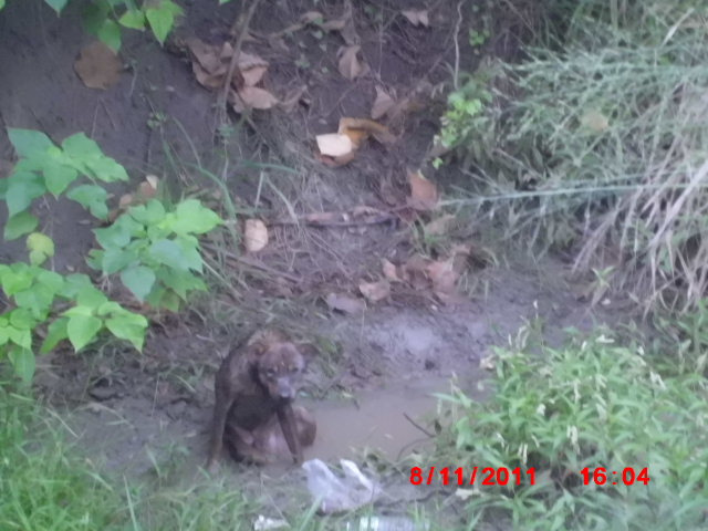 在瓜田爛泥巴中來回搜尋,有做食的工人看見是一隻咖啡色狗狗 ,昨天沿著樹林土堆中一直托行
