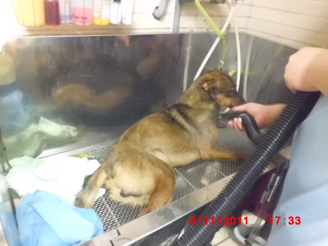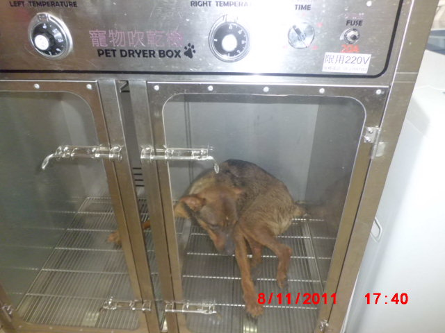 狗狗戒心很重,但是必須將狗先清理乾淨將全身濕毛髮吹乾
